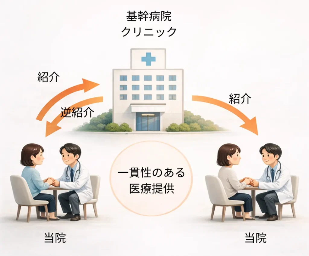 当院と周辺医療機関の間では、緊密な連携による情報共有を行っております。患者さんは異なる医療機関でありながら、適切で一貫性のある患者さん中心の医療を受けることができます。そのため、患者さんが当院からの紹介状を持参して他医療機関を受診された際や、緊急時に救急搬送された際は、他医療機関での治療が終了次第、速やかに当院にお戻り頂くことで継続した治療を受けられることになります。